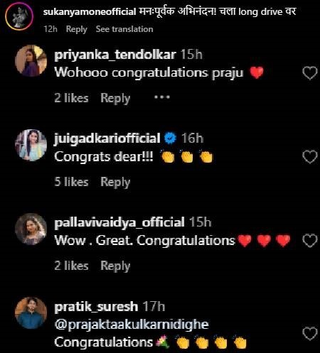 अभिनेत्रीच्या या व्हिडीओवर कलाकार मंडळींसह चाहत्यांनी भरभरून प्रतिक्रिया दिल्या आहेत. अभिनेत्री सुकन्या मोने, जुई गडकरी, प्रियांका तेंडोलकर, पल्लवी वैद्य, मोनिका दबडे अशा अनेक कलाकारांनी प्राजक्ता यांना शुभेच्छा दिल्या आहेत.