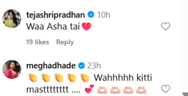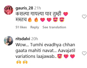 याबरोबरच सावळ्याची जणू सावली मालिकेत भैरवीची भूमिका साकारणारी अभिनेत्री मेघा धाडेने “वाह! किती मस्त”, असे लिहित कौतुक केले आहे. कलाकारांबरोबरच नेटकऱ्यांनी अभिनेत्रीचे कौतुक केले आहे. ” ताई, एवढं सुंदर गात आहात. आवाजातील चढ उतार खुप छान. खलनायिका म्हणून असणारी तुमची मनातील छबी यामुळे बदलुन गेली. “, “उत्तम”, “वाह! तु्म्ही इतके छान गाता हे माहित नव्हतं.”, “अप्रतिम”, “अतिसुंदर”, “कमाल”, अशा अनेक कमेंट्स पाहायला मिळत आहेत. तसेच अनेकांनी हार्ट इमोजी शेअर करत त्यांच्या भावना व्यक्त केल्या आहेत.