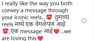 आता हा व्हिडीओ पाहिल्यानंतर अभिनेत्री शीतल क्षीरसागर यांनी लिहिले की, वाह! विचार आणि हावभाव दोन्ही परफेक्ट आहेत. तसेच अनेक नेटकऱ्यांनीदेखील त्यांचे कौतुक केले आहे. “तुम्ही ज्या पद्धतीने रीलमधून संदेश देता, ते मला खूप आवडते.”, “ज्या पद्धतीने तुम्ही तुमचे विचार सांगता, ते खूप छान आहे”, “छान विचार. छान नृत्यदिग्दर्शन. छान जोडी. प्रत्येक वेळी तुम्ही अशी विचार करायला लावणारी गोष्ट घेऊन येता.”, “हो, मी हे तुमच्या मैत्रीमध्ये पाहू शकतो”, “कसं काय सुचतं तुम्हाला”, अशा अनेक कमेंट्स पाहायला मिळत आहेत. अनेकांनी हार्ट इमोजी शेअर केल्या आहेत.