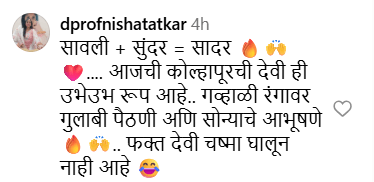 एका नेटकऱ्याच्या कमेंटने लक्ष वेधले आहे. नेटकऱ्याने लिहिले, “सावली + सुंदर = सादर. आजची कोल्हापूरची देवी हे हुबेहूब रूप आहे. गव्हाळी रंगावर गुलाबी पैठणी अणि सोन्याचे आभूषणे खूप सुंदर दिसत आहेत. फक्त देवीने चष्मा घातला नाही.” असे लिहीत हसण्याची इमोजी शेअर केली आहे. इतर नेटकऱ्यांनी लिहिले, “मनमोहिनी”, “चष्मा पाहिजेच का?”, “सावलीच्या चष्म्याने सुंदर लूक दिसत आहे”, “सावलीचा चष्मा काढून फोटो काढायला पाहिजे”, “चष्मा”, “क्यूट”, अशा अनेक कमेंट्स पाहायला मिळत आहेत.