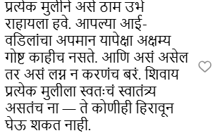 “तेजश्रीचा अभिनय एक नंबर आहे आणि ती खूप सुंदर दिसतेसुद्धा”, “प्रत्येक मुलीनं असं ठाम उभं राहायला हवं. आपल्या आई-वडिलांचा अपमान यापेक्षा अक्षम्य गोष्ट काहीच नसते आणि असं असेल तर असं लग्न न करणंच बरं. त्याशिवाय प्रत्येक मुलीला स्वतःचं स्वातंत्र्य असतंच. ते कोणीही हिरावून घेऊ शकत नाही”, अशा अनेक कमेंट्स पाहायला मिळत आहेत.