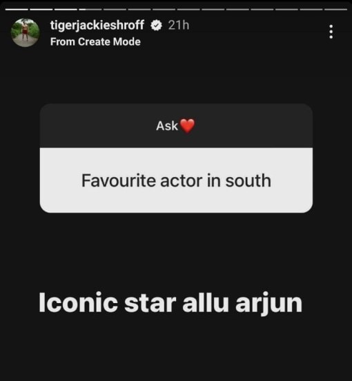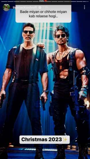 चाहत्यांशी केलेल्या इंटरअॅक्शनमध्ये टायगरला ‘तुमचा आवडता दाक्षिणात्य अभिनेता कोण’ असा सवाल एका चाहत्याने केला. त्यावर त्याने ‘आयकॉनिक स्टार अल्लू अर्जुन’ असे उत्तर दिले. तसेच एका चाहत्याच्या ‘तुझा बडे मियाँ छोटे मियाँ चित्रपट कधी प्रदर्शित होणार आहे’ या प्रश्नाचे उत्तर देताना त्याने ‘ख्रिसमस २०२३’ असे लिहिलेला त्याचा आणि अक्षय कुमारचा फोटो स्टोरीवर शेअर केला.
