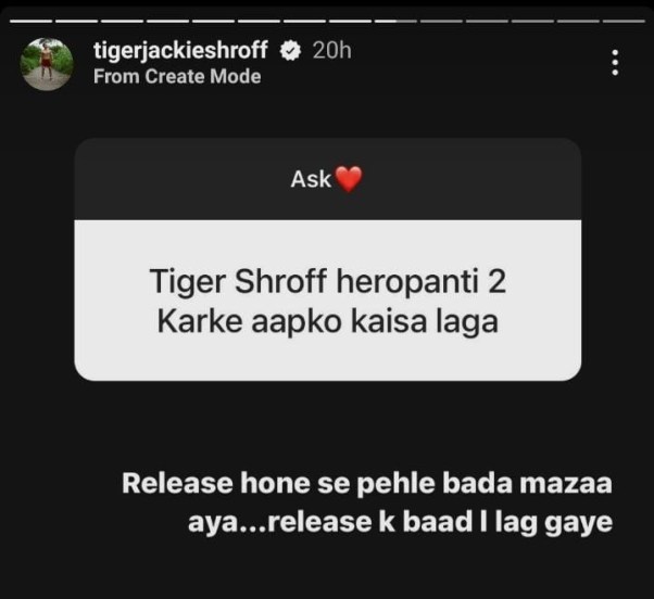 टायगर श्रॉफ सोशल मीडियावर सक्रिय असणाऱ्या सिनेकलाकारांपैकी एक आहे. तो इन्स्टाग्रामवर सतत फोटो-व्हिडीओ शेअर करत असतो. या माध्यमातून तो चाहत्यांशी संवाद साधण्याचा प्रयत्न करत असतो. नुकतीच त्याने इन्स्टाग्रामवर ‘Ask’ असे म्हणत स्टोरी पोस्ट केली होती. या स्टोरीवरुन टायगरच्या चाहत्यांनी त्याला बरेचसे प्रश्न विचारले. दरम्यान एका चाहत्याने त्याला “हिरोपंती २ केल्यानंतर तुम्हाला कसे वाटत आहे” असा प्रश्न विचारला. तेव्हा त्या प्रश्नाचे उत्तर देत त्याने नवीन स्टोरी शेअर केली. यामध्ये त्याने “चित्रपटाच्या प्रदर्शनापूर्वी खूप मजा आली… पण प्रदर्शन झाल्यानंतर वाट लागली” असे लिहिले होते.