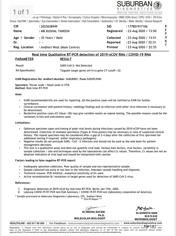 काही दिवसांपूर्वी कुशल टंडनमध्ये करोनाची लक्षणं आढळली होती. त्यामुळे त्याने करोना चाचणी केली. यात त्याचे रिपोर्ट्स निगेटिव्ह आले आहेत. ही माहिती त्याने सोशल मीडियावर दिली आहे. ट्विटरवर त्याने आपले रिपोर्ट्स शेअर केले आहेत.