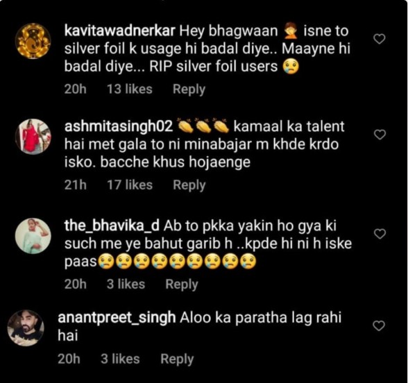 उर्फीचा हा लूक नेटकऱ्यांना काही आवडलेला नाही. तिच्या या व्हिडीओर कमेंट करत नेटकऱ्यांनी तिला ट्रोल केले आहे. एक नेटकरी म्हणाला, ‘देवा हिने तर सिलव्हर फॉइलचे महत्त्व बदलले आहे. RIP सिलव्हर फॉइल यूजर्स.’ दुसरा नेटकरी म्हणाला, ‘खूप कौशल्य आहे हिच्यात, मेट गाला नाही पण मीना बाजारत उभ करा.’ तिसरा नेटकरी म्हणाला, ‘आता तर मला विश्वास झाला आहे की ही खरचं गरीब आहे. हिच्याकडे कपडे नाहीत.’ आणखी एक नेटकरी म्हणाला, ‘आलू का पराठा लग रही है’, अशा अनेक कमेंट करत नेटकऱ्यांनी तिला ट्रोल केले आहे.