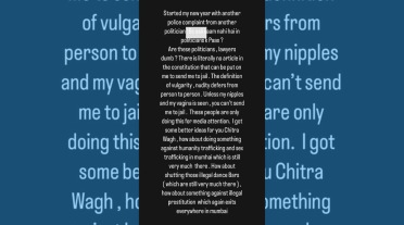 उर्फी म्हणाली की, “माझ्या नवीन वर्षाची सुरुवात आणखी एका पोलिसांच्या तक्रारीने झाली आहे. या राजकारण्यांना काही खरी कामं नाही आहेत का? या राजकारण्यांना, वकिलांना कळत नाही का? आपल्या संविधानात असा कोणताच नियम नाही ज्यानुसार ही लोकं मला जेलमध्ये पाठवू शकतील. माझे निप्पल व व्हजायना जोपर्यंत दिसत नाही तोपर्यंत मला तुम्ही तुरुंगात टाकू शकत नाही. तुम्हाला फक्त मीडियाचं लक्ष वेधून घ्यायचं आहे. चित्रा वाघ, मी तुम्हाला आणखी चांगल्या कल्पना देते, तुम्ही सेक्स ट्रॅफिकिंग विरुद्ध काम करा, अवैध डान्स बारवर बंदी आणा, अवैध देहविक्री व्यवसायावर बंदी आणा, या सर्व समस्या मुंबईत आहेत त्यांच्याकडे लक्ष द्या.