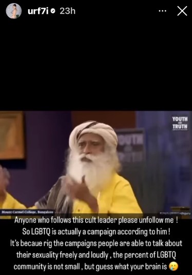 उर्फीने शेअर केलेल्या या व्हिडिओमध्ये सद्गुरू LGBTQ समुदायाबद्दल आणि त्यांच्याकडून होणाऱ्या कॅम्पेनबद्दल त्यांचं मत मांडत आहेत. ते म्हणतात की “आज या समुदायाच्या विरोधात काही लोक आहेत तर काही लोक याचं समर्थन करत आहेत, त्यामागचं सर्वात मोठं कारण म्हणजे यासाठी जगभरात सुरू असलेली मोहीम. ही मोहीम कुठेतरी थांबायला हवी. या समुदायातील लोकांची संख्या ही फार तुरळक आहे, आणि या मोहिमेमुळेच ती दिवसागणिक वाढते आहे. लैंगिकता ही एक बायोलॉजीकल प्रक्रिया आहे. निसर्गाने तुम्हाला जसा जन्म दिला आहे तो न स्वीकारता तुम्ही वेगळ्या मार्गाने जाण्याचा विचार करत असाल तर तो प्रत्येकाचा वैयक्तिक प्रश्न आहे.”