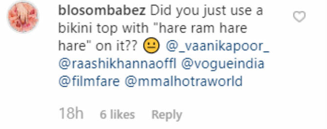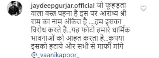 वाणीने नव्या लूकमधील एक फोटो नुकताच इन्स्टाग्रामवर शेअर केला आहे. मात्र या फोटोमध्ये तिने जे कपडे घातले आहेत त्यामुळे तिला ट्रोल व्हावं लागलं आहे. शेअर केलेल्या फोटोमध्ये वाणीने तंग कपडे परिधान केले असून त्यावर ‘हे राम’ नावाची प्रिंट आहे. तिचे हे कपडे पाहिल्यानंतर नेटकऱ्यांमध्ये संतापाचं वातावरण पसरलं. अनेकांनी तिला ट्रोलदेखील केलं.