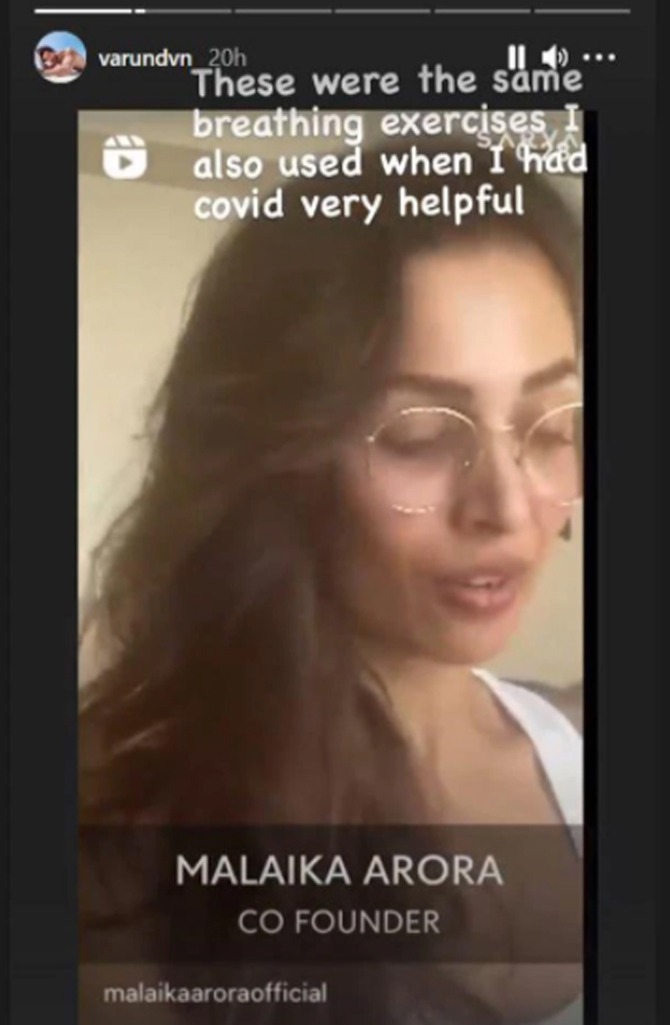 वरुणने त्याच्या इन्स्टाग्राम अकाऊंटच्या स्टोरीवर मलायकाचा एक व्हिडीओ शेअर केला आहे. मलायकाच्या या व्हिडीओत तिने आणि तिच्या संपूर्ण योगा टीमने ब्रिथिंग एक्सरसाइज वेगवेगळ्या भाषेत समजवले आहेत. ‘या त्याच ब्रिथिंग एक्सरसाइज आहेत, ज्या मी करोना संक्रमित झालो होतो तेव्हा करायचो,’ अशा आशयाचे कॅप्शन वरुणने दिले आहे.