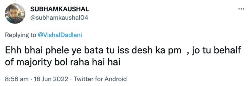 विशालनं जेव्हा मुस्लिम बांधवांच्या बाजुनं जेव्हा अशाप्रकारचे ट्वीट केले त्यानंतर त्याला मोठ्या प्रमाणात टीका होतं आहे. एक नेटकरी विशालला ट्रोल करत म्हणाला, “भाऊ सगळ्यात आधी हे सांग की तू या देशाचा पंतप्रधान आहेस का?, जे तू बहुसंख्याकांच्या वतीने बोलत आहेस”, असे बरेच ट्वीट करत नेटकऱ्यांनी विशालला सोशल मीडियावर ट्रोल केले आहे.