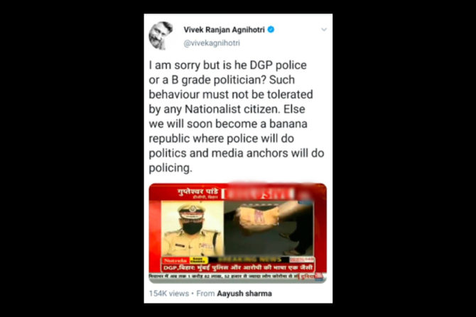 “माफ करा पण हे पोलीस आहेत की बी ग्रेड राजकारणी? अशा प्रकारचा व्यवहार कुठलाही नॅशनलिस्ट सहन करणार नाही. जनतेनं आवाज उठवला नाही तर पोलीस राजकारण करतील आणि माध्यमं त्यांना प्रोत्साहन देतील.” अशा आशयाचं ट्विट करुन विवेक अग्निहोत्री यांनी डीजीपी गुप्तेश्वर पांडे यांच्यावर टीका केली होती. परंतु या ट्विटमुळे त्यांना ट्रोल केलं गेलं. सोशल मीडियाद्वारे त्यांच्या विरोधात संताप व्यक्त केला गेला. अखेर सातत्याने होणाऱ्या ट्रोलिंगला वैतागून विवेक अग्निहोत्री यांनी आपलं ट्विट डिलिट केलं. शिवाय डीजीपी गुप्तेश्वर पांडे यांची माफी देखील मागितली.