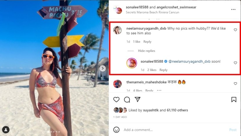 नुकतंच सोनालीने तिच्या हनिमूनचे आणखी काही फोटो पोस्ट केले आहेत. या फोटोत तिने छान स्विमसूट परिधान केला आहे. एका बीचवर हटके फोटोशूट केलेले फोटो तिने शेअर केले आहेत. मात्र तिच्या या फोटोवर कमेंट करत एका चाहतीने हटके प्रश्न विचारला आहे.