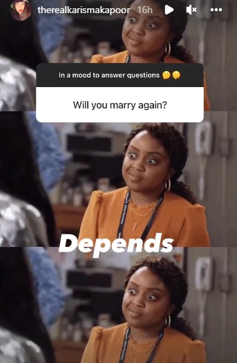 करिश्माने तिच्या इन्स्टाग्राम अकाऊंटवरून (Ask Me Anything) द्वारे चाहत्यांशी संपर्क साधला होता. यावेळी एका नेटकऱ्याने करिश्माला पुन्हा लग्न करणार का? असा प्रश्न विचारला. याप्रश्नावर करिश्मा गोंधळलेल्या मुलीचा फोटो शेअर करत म्हणाली, विचार करेन. आता करिश्माने दिलेल्या या उत्तरामुळे सगळ्यांना प्रश्न पडला आहे की करिश्मा लवकरच लग्नबंधनात अडकणार आहे का?