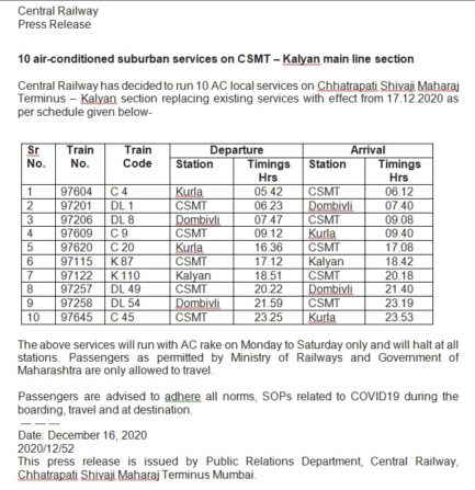 Central Railway has decided to run 10 AC local services on Chhatrapati Shivaji Maharaj Terminus (CSMT)- Kalyan section from tomorrow. #Maharashtra