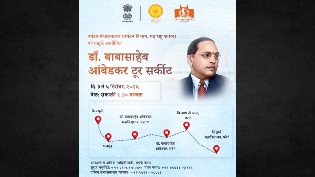या टूर सर्कीटच्या माध्यमातून डॉ. बाबासाहेब आंबेडकर यांच्या पदस्पर्शाने पावन झालेली स्थळे आणि प्रेरणादायी जीवनाचा प्रवास, सामाजिक समता, शिक्षण आणि संविधान निर्मितीतील योगदानाचे महत्त्व सर्व सामान्य नागरिक व पर्यटकांपर्यंत पोहोचविण्याचा हा शासनाचा प्रयत्न आहे. सदर टूर सर्कीटची सुरुवात चैत्यभूमी, दादर, मुंबई येथून सकाळी ९.३० वाजता होऊन समारोप चैत्यभूमी दादर येथे होणार आहे. सहलीसाठी संपर्क : सूरज चतुर्वेदी – ८१०८१७५५३०/ पवन पवार – ७६६६६०३२११ / पर्यटन संचालनालय चॅटबोट क्र – ९९९३३०८८८३ संपर्क साधता येईल.