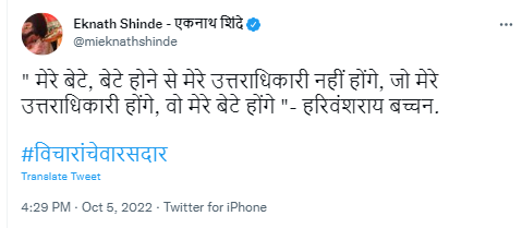 ‘मेरे बेटे, बेटे होने से मेरे उत्तराधिकारी नही होंगे, जो मेरे उत्तराधिकारी होंगे, वो मेरे बेटे होंगे’ या हरिवंशराय बच्चन यांच्या ओळी शिंदेंनी ट्वीट केल्या होत्या. त्यांनी ‘विचारांचे वारसदार’ हा हॅशटॅगही वापरला होता. त्यांनी हे ट्वीट करत घराणेशाहीच्या मुद्दयावर ठाकरे पिता-पुत्रांची कोंडी करण्यासाठी वातावरण निर्मीती केली होती. आपल्या मेळाव्यामधील भाषणामध्येही हाच मुद्दा पुढे नेत उद्धव यांनी शिवसेना वाढविण्यासाठी काय केले असा सवाल करत शिंदे यांनी नोकर आणि मालकाचा संदर्भ देत केला. यामधून शिंदे यांनी शिवसैनिकांची सहानभूतीही मिळविण्याचा प्रयत्न केल्याचे दिसून आले.