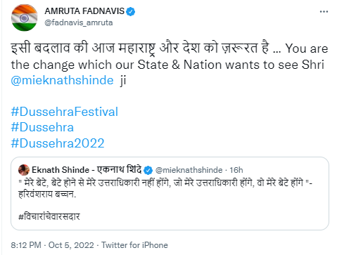 त्यानंतर सायंकाळी आठच्या सुमारास उद्धव ठाकरे यांनी शिवाजी पार्कवरुन भाषणाला सुरुवात केली. मात्र उद्धव यांचं भाषण सुरु असतानाच अमृता फडणवीस यांनी एकनाथ शिंदेंनी केलेलं हे ट्वीट कोट करुन रिट्वीट करत प्रतिक्रिया नोंदवली. “याच बदलाची आज महाराष्ट्र आणि देशाला गरज आहे. आपल्या राज्याला आणि देशाला जो बदल पाहण्याची अपेक्षा आहे तो तुम्हीच आहात एकनाथ शिंदेजी,” असं अमृता यांनी ट्वीटरवर म्हटलं आहे.