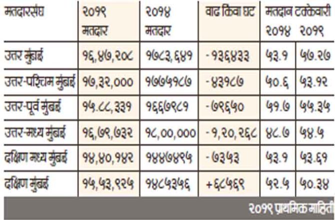 मुंबईत २०१४ मध्ये सरासरी ५१.६ टक्के इतके मतदान झाले होते. त्यात या वेळी वाढ झाल्याचे दिसून येत असले तरी त्यास काही प्रमाणात दक्षिण मुंबई वगळता पाच लोकसभा मतदारसंघांमधील मतदारांमध्ये झालेली घटही कारणीभूत आहे. मुंबई शहर व उपनगर जिल्हाधिकाऱ्यांनी मतदारयाद्यांची पडताळणी करताना निधन झालेले, पत्ता बदललेले आणि दुबार नावे असलेले मतदार वगळले. त्यामुळे मतदारांची संख्या कमी झाली आहे. मतदार घटल्याने साहजिकच मतदानाची टक्केवारी काही प्रमाणात वाढली आहे. मात्र उमेदवारी अर्ज भरण्याच्या अंतिम तारखेच्या आधी १० दिवसांपर्यंत नवीन मतदारांना नावे नोंदविण्याची संधी होती. त्यामुळे मतदारसंख्येत काही प्रमाणावर पुन्हा भर पडली, तरीही २०१४च्या तुलनेत मतदारांची संख्या कमी झाली आहे.