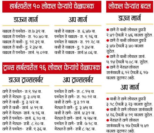 मध्य रेल्वेच्या हार्बर तसेच ठाणे-वाशी-पनवेल ट्रान्स हार्बर मार्गावरील प्रवाशांना मोठा दिलासा देत बुधवारी ३१ जानेवारीपासून या मार्गावर २६ नवीन लोकल फेऱ्या सुरू करण्यात येत आहेत. यापैकी १६ फेऱ्या ट्रान्सहार्बरवर तर १० हार्बरवरील आहेत. तसेच या फेऱ्या सामावून घेण्यासाठी सध्याच्या आठ लोकल फेऱ्यांच्या वेळेत बदल करण्यात आले आहेत.