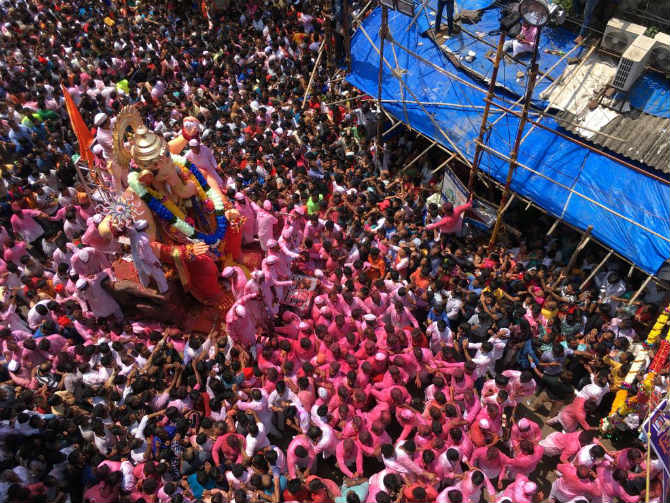 श्रॉफ बिल्डिंग पुष्पवृष्टी मंडळातर्फे लालबागच्या राजावर दरवर्षीप्रमाणे यंदाही पुष्पवृष्टी करण्यात आली आहे. ( छाया सौजन्य : दिलीप कागडा)