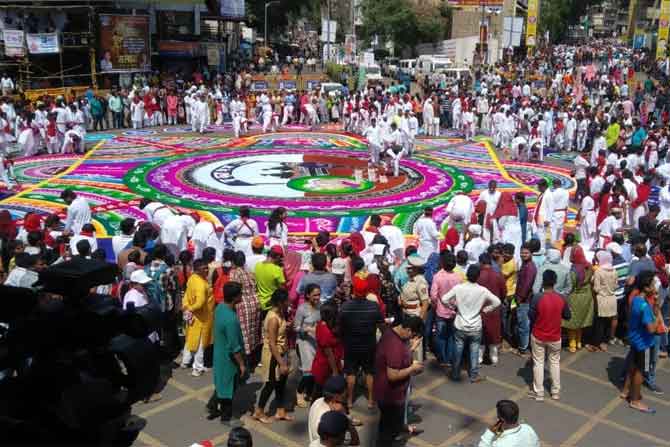 राज्याची सांस्कृतिक राजधानी असलेल्या पुण्यनगरीतील मानाच्या गणपतींना निरोप देण्यासाठी अलका टॉकीज चौकात भव्य रांगोळी रेखाटण्यात आली आहे. संस्कार भारतीची ही रांगोळी उपस्थितांचे लक्ष वेधून घेत आहे. ज्येष्ठ नागरिकांवर होणारे अत्याचार रोखण्यायासाठी जनजागृती करण्यात आली आहे.
