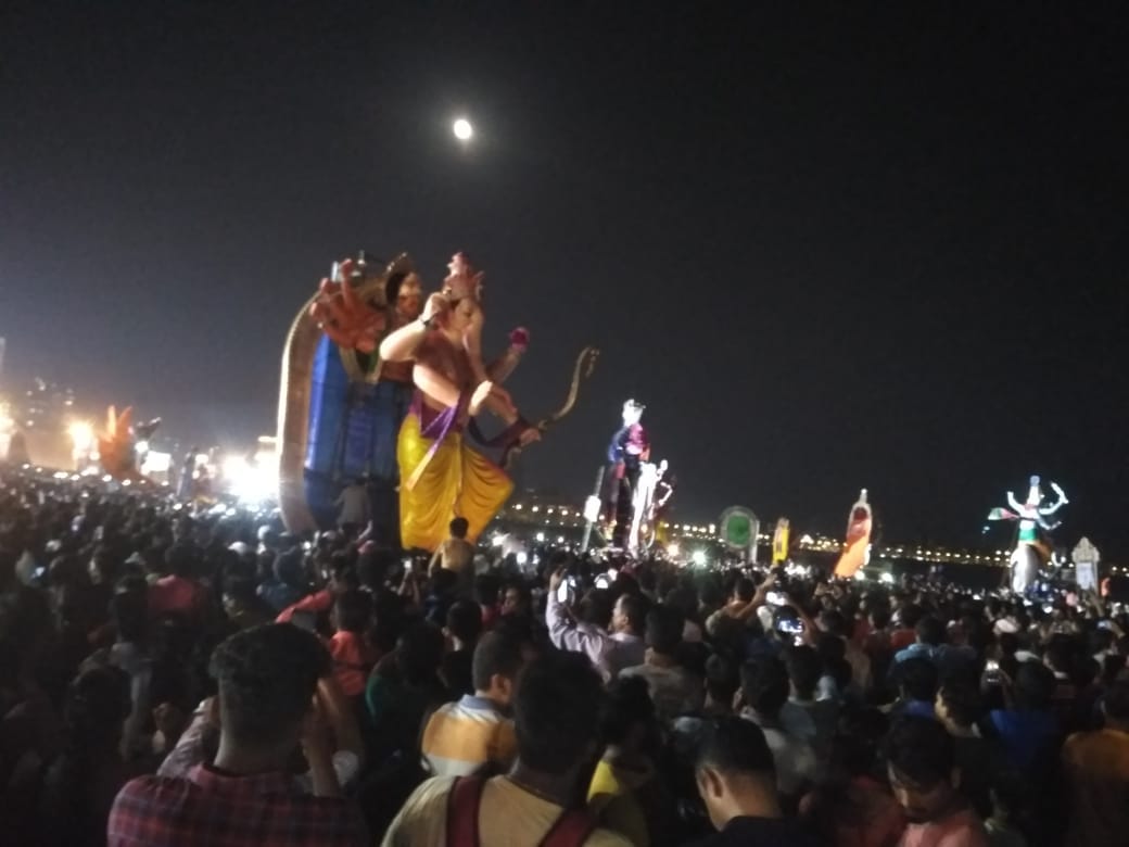 मुंबईतील जुहू चौपाटीवर बाप्पांच्या विसर्जनासाठी भाविकांची गर्दी जमली आहे. गिरगाव, दादर चौपाटीनंतर उपनगरातील अनेक घरगुती आणि सार्वजनिक गणपतीचं विसर्जन जुहू चौपाटीवर केलं जातं.