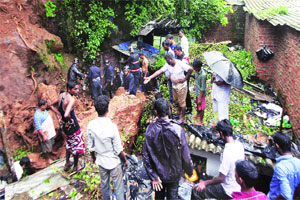 अॅन्टॉप हिल येथील शेख मिस्त्री दर्गाह रोडवरील जुन्या टपाल कार्यालयाजवळील टेकडीवरून चार झोपडय़ांवर बुधवारी सकाळी आठच्या सुमारास दरड कोसळली. ढिगाऱ्याखालून काढण्यात आलेल्या संदीप रामअवतार केवट (२२), रामअवतार पावारू केवट (४५) आणि सलीम शेख (२७) यांना तातडीने शीव रुग्णालयात दाखल करण्यात आले. मात्र उपचारादरम्यान संदीप आणि रामअवतार यांचे निधन झाले. ढिगाऱ्याखाली आणखी पाच जण अडकल्याची भीती आहे. रात्री उशिरापर्यंत सुरू असलेला मुसळधार पाऊस आणि चिंचोळ्या रस्त्यामुळे बचावकार्यात अडथळे येत होते.