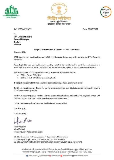 कोटेचा म्हणाले की, “काहीही करून आपल्या मर्जीतील ठेकेदार व कंपन्या यांनाच कंत्राटं मिळालं पाहिजे याची संपूर्ण सोय प्रशासनाला दबावात आणून केली जाते. तो प्रस्तावच यापद्धतीने तयार केला जातो की इतर कंपन्या सहभागी होतील पण पात्र ठरणार नाहीत,” असा आरोप भाजपाचे आमदार मिहिर कोटेचा यांनी केली.