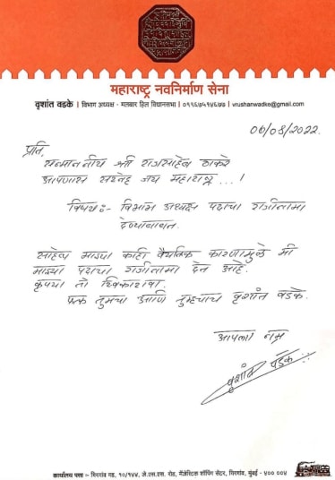 “सन्माननीय राजसाहेब ठाकरे आपणास सस्नेह जय महाराष्ट्र” असं म्हणत पत्रातील मजकूर लिहिण्यात आला आहे. “साहेब माझ्या काही वैयक्तिक कारणामुळे मी माझ्या पदाचा राजीनामा देत आहे. कृपया तो स्वीकारावा. फक्त तुमचा आणि तुमचाच वृशांत वडके,” असा मजकूर या पत्रामध्ये आहे. या पत्राचा विषय ‘विभाग अध्यक्ष पदाचा राजीनामा देण्याबाबत’ असा आहे.