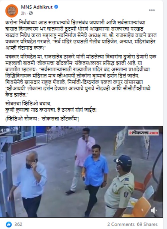 मंगळवारी मुंबई पार पडलेल्या पत्रकार परिषदेमध्ये मनसेचे अध्यक्ष राज ठाकरे यांनी करोना निर्बंधांच्या आड सत्ताधाऱ्यांचे हितसंबंध जपणारी आणि सर्वसामान्यांच्या त्रासात विनाकारण भर घालणारी दुटप्पी धोरणं सरकार आखत असल्याची टीका केली होती. तसेच “सर्व मंदिरं उघडली गेलीच पाहिजेत. अन्यथा, मंदिरांबाहेर आम्ही घंटानाद करू,” असं म्हटलं होतं. याचाच संदर्भ लोकसत्ता डॉट कॉमच्या व्हिडीओशी जोडून मनसेने व्हिआयपींना परवानगी दिली जाते याबद्दल नाराजी व्यक्त केलीय. कुणी कुणाचा नाद करायचा, हे ठरवणं सोपं जाईल, असं मनसेनं म्हटलं आहे.