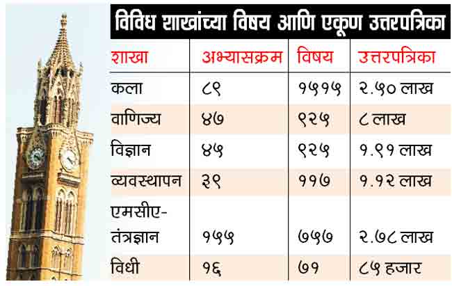 ‘शुक्रवारी सायंकाळपर्यंत एकूण १० लाख ७४ हजार उत्तरपत्रिकाचे मूल्यांकन पूर्ण करण्यात आले होते. तसेच पुनर्मुल्यांकनाचेकामही सुरू झाले आहे. आतापर्यंत ४० टक्के पुनर्मूल्यांकनाचे काम झाले आहे,’ अशी माहिती परीक्षा नियंत्रक दीपक वसावे यांनी दिली. राज्यपालांनी दिलेल्या मुदतीत निकाल जाहीर करण्याचा आमचा प्रयत्न आहे, अशी पुस्तीही त्यांनी जोडली. मात्र परीक्षा विभागातील सूत्रांनी दिलेल्या माहितीनुसार ३१जुलैपर्यंत फारतर तंत्रज्ञान (अभियांत्रिकी) आणि विज्ञान शाखांच्याच परीक्षांचे निकाल जाहीर करणे शक्य होईल. कारण या शाखांच्या उत्तरपत्रिका मूल्यांकनाचे ९० ते ९५ टक्के काम पूर्ण झाले आहे. उर्वरित कला आणि वाणिज्य शाखांतील उत्तरपत्रिकांचे केवळ ५५ ते ६० टक्के इतकेच मूल्यांकन झाले आहे. या सर्वात मोठय़ा समजल्या जाणाऱ्या शाखांचे निकाल महिनाभर तरी रखडण्याची शक्यता आहे. कारण या शाखांचे मूल्यांकनाचे काम केवळ ५० टक्के इतकेच झाले आहे.