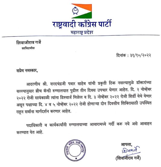 दरम्यान ३ नोव्हेंबरला शरद पवार शिर्डीला जाणार आहेत. पक्षाचं दोन दिवसांचं शिबीर होणार असून त्यासाठी ते उपस्थित राहून मार्गदर्शन करतील अशी माहिती पक्षाने दिली आहे.