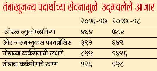 तंबाखूजन्य पदार्थाच्या सेवनामुळे उद्भवलेल्या आजारांमध्ये ‘ओरल सबम्युकस फायब्रोसिस’चे प्रमाण गेल्या वर्षीच्या तुलनेत या वर्षी मोठय़ा प्रमाणात वाढले आहे. या आजारामध्ये तंबाखूजन्य पदार्थाच्या सेवनामुळे जबडय़ाचे स्नायू ताठरतात. त्यामुळे तोंड उघडण्यास त्रास होतो. सामान्यपणे माणसाचे तोंड हे दोन ते अडीच इंच इतक्या प्रमाणात उघडते. परंतु या रुग्णांना अर्धा किंवा एक इंचापेक्षा जास्त तोंड उघडता येत नाही. २०१६-१७ मध्ये या आजाराचे ३९१ रुग्ण आढळले होते, तर २०१७-१८ मध्ये या रुग्णांची संख्या तब्बल ६४२ वर पोहोचली आहे. तसेच ‘ओरल ल्युकोपाकिया’आजाराच्या या रुग्णांची संख्याही गेल्या वर्षांच्या तुलनेत वाढली आहे. या आजारामध्ये तोंडामध्ये पांढरे चट्टे येतात. २०१६-१७ मध्ये या आजाराचे रुग्णांची संख्या ४६४ होती, तर २०१७-१८ या काळात ती ७८४ वर पोहोचली आहे. हे दोन्ही आजार तोंडाच्या कर्करोगाची लक्षणे आहेत. ही लक्षणे आढळलेले रुग्ण हे अगदी १५ वर्षांपासून ते ८० वयापर्यंतचे आहेत. यामध्ये तरुण पिढीचे रुग्ण मोठय़ा प्रमाणात आहेत, असे शासकीय दंत रुग्णालयाचे अधिष्ठाता डॉ. मानसिंग पवार यांनी सांगितले.