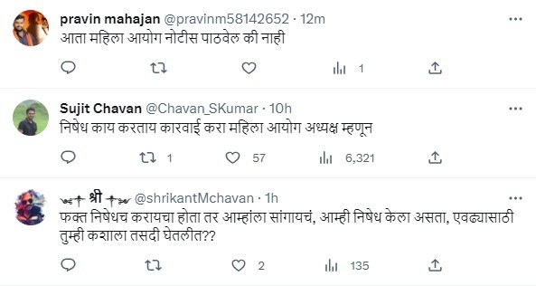 एका युजरने रुपाली चाकणकरांच्या ट्वीटवर त्यांनी राज्य महिला आयोग अध्यक्ष म्हणून कारवाई करावी, अशी मागणी केली. अन्य एका युजरने “अवस बाई इकडे, पुनव बाई तिकडे”, अशी यांची अवस्था असल्याची टीका केली. एका युजरने तर चाकणकर यांनी एकाचवेळी महिला आयोग अध्यक्षपदी आणि पक्षाच्या पदावर राहण्यावर आक्षेप घेतला. तसेच त्यांनी आयोगाचं पद सोडावं, नाहीतर पक्षाचं पद सोडावं, अशी मागणी केली.