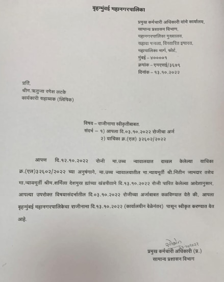 राजीनामा स्वीकृतीबाबत असा या पत्राचा विषय आहे. तर पत्राच्या मजकुरामध्ये, “आपण १२ ऑक्टोबर २०२२ रोजी माननिय उच्च न्यायालयात दाखल केलेल्या याचिकाच्या अनुषंगाने, न्यायालयातील न्यायमूर्ती नितीन जामदार तसेच न्यायमूर्ती शर्मिला देशमुख यांच्या खंडपीठाने १३ ऑक्टोबर रोजी पारित केलेल्या आदेशानुसार आपल्या उपरोक्त विषयासंदर्भात दिनांक ३ ऑक्टोबर रोजीच्या अर्जाबाबत कळविण्यात येते की. आपला बृहन्मुंबई महानगरपालिकेचा राजीनामा १३ ऑक्टोबर २०२२ (कार्यालयीन वेळेनंतर) पासून स्वीकृत करण्यात येत आहे,” असं म्हटलं आहे.