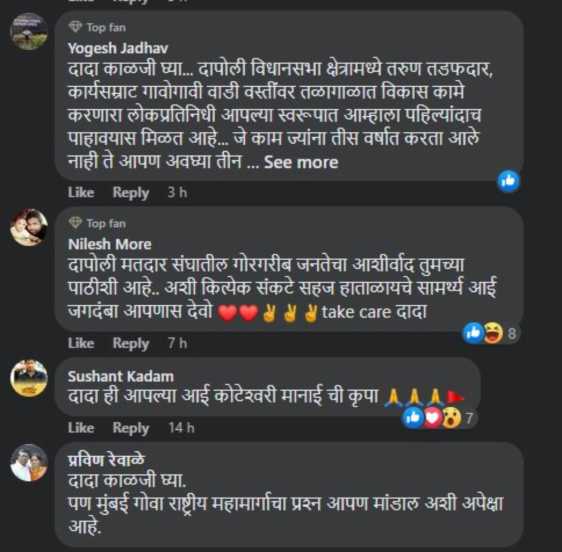 यातील कदम समर्थकांनी त्यांना काळजी घेण्याची विनंती केली. तसेच त्यांची दापोली विधानसभा मतदारसंघातील नागरिकांना गरज असल्याची भावना व्यक्त केली. एका नेटकऱ्याने म्हटलं, “दापोली विधानसभा क्षेत्रामध्ये पहिल्यांदा तरुण तडफदार, आमदार आहेत. गेल्या तीन वर्षांत तुम्ही जी विकास कामं केली आणि अडचणीच्या वेळेला साथ दिली ते जनता कधीही विसरणार नाही. जनतेचा आशीर्वाद आपल्या पाठीशी आहे.”