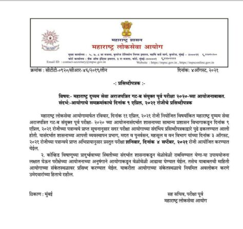 करोना विषाणूच्या प्रादुर्भावाच्या स्थितीच्या संदर्भात शासनाकडून वेळोवेळी राबविण्यात येणाऱ्या उपाययोजना लक्षात घेऊन परीक्षेच्या आयोजनाच्या अनुषंगाने आयोगाकडून वेळोवेळी आढावा घेण्यात येईल. तसेच याबाबतची माहिती आयोगाच्या संकेतस्थळावर प्रसिद्ध करण्यात येईल. याकरीता आयोगाच्या संकेतस्थळाचे नियमित अवलोकन करणे उमेदवारांच्या हिताचे राहील, असे परिपत्रकात म्हटले आहे