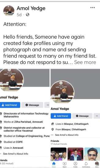 यापूर्वी असाच प्रकार तत्कालीन पोलीस अधीक्षक डॉ. दिलीप पाटील भुजबळ यांच्यासोबतही घडला होता. याचप्रकारे सायबर फ्रॉडर्सने चक्क जिल्हाधिकारी अमोल येडगे यांच्या नावाने बनावट फेसबुक प्रोफाईल तयार केले. हा प्रकार जिल्हाधिकारी अमोल येडगे यांच्या लक्षात येताच त्यांनी आपल्या स्वत:च्या फेसबुक अकाउंटवर पोस्ट करून परिचयातील लोकांना सावधान केले. याप्रकरणी जिल्हाधिकारी येडगे यांनी यवतमाळ शहर पोलीस ठाण्यात तक्रार दिली. २ ते १७ जून कालावधीत फेसबुक अकाउंट बनविले. मित्र, ओळखीचे लोक व सर्वसामान्य नागरिकांची फसवणूक होईल, असे कृत्य केले, असा उल्लेख तक्रारीत आहे. त्यावरून फसवणुकीचा गुन्हा नोंदविण्यात आला. बनावट फेसबुक अकाउंट बनविणार्या तोतयाचा शोध सायबर पोलिसांकडून घेतला जात आहे.