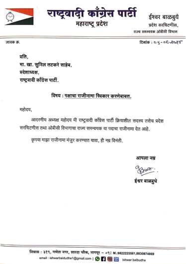 लाकडी बहीण योजनेच्या निमित्ताने ३१ ऑगस्टला नागपुरात महिला मेळावा झाला. त्याला अजित पवारही उपस्थित होते. राष्ट्रवादीची जनसन्मान यात्राही या निमित्ताने काढण्यात आली. विधानसभा निवडणुकीच्या पार्श्वभूमीवर पक्ष बळकट करण्याचे आवाहन या यात्रेच्या निमित्ताने अजित पवार यांनी कार्यकर्त्यांनी केले होते. मात्र पाचच दिवसाने बाळबुधे यांनी त्यांचा राजीनामा पक्षाचे प्रदेशाध्यक्ष सुनील तटकरे यांना पाठवला आहे.त्यात त्यांनी राष्ट्रवादीच्या क्रियाशील सदस्यत्वाचा, प्रदेश सरचिटणीसपदाचा आणि पक्षाच्या ओबीसी विभागाच्या राज्य समन्वयक पदाचा राजीनामा देत असल्याचे नमुद केले आहे.