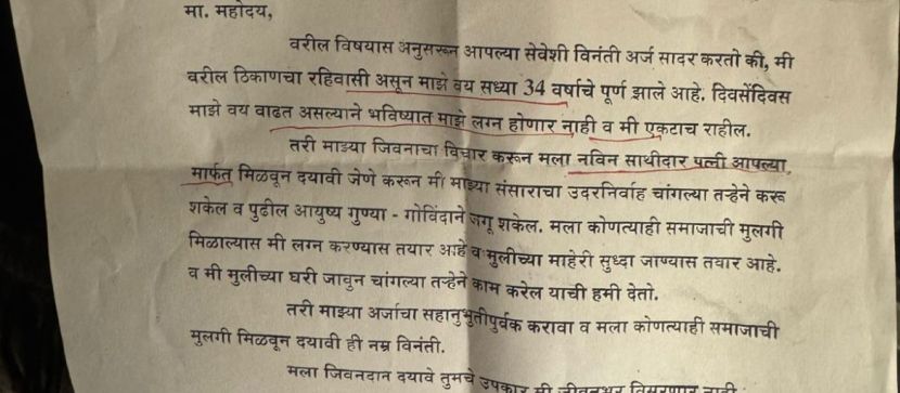 या लग्नाळू तरुणाने शरद पवार यांना लिहलेल्या पत्रात म्हटले आहे की, ”माझे वय वाढतेय. भविष्यात माझे लग्न होणार नाही. मी एकटाच राहीन. तरी माझ्या जीवनाचा विचार करुन मला पत्नी मिळवून द्यावी. मला कोणत्याही समाजातील मुलगी चालेल. तिच्या घरीही मी राहायला तयार आहे. तिथे चांगले काम करीन आणि संसार नीट चालवीन, याची हमी मी देतो. मला जीवनदान द्यावे. तुमचे उपकार मी विसरणार नाही.” तरुणाचे हे पत्र आज समाज माध्यमावर प्रचंड प्रसारित झाले.