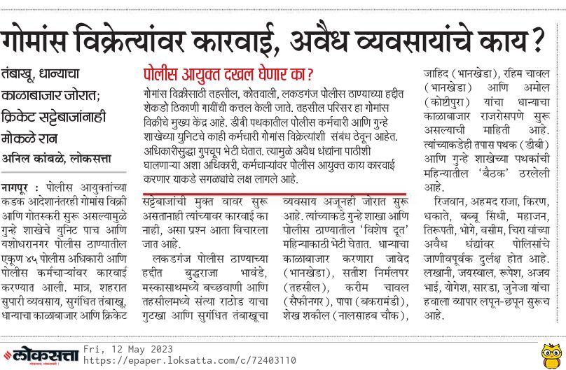 सूत्रांनी दिलेल्या माहितीनुसार, लकडगंज, तहसील, कोतवाली पोलीस ठाण्याच्या हद्दीत अनेक अवैध धंदे सुरू होते. त्या धंद्यांना तपास (डीबी) पथकातील कर्मचाऱ्यांचा ‘आशीर्वाद’ होता. त्यामुळे कोट्यावधींची उलाढाल सडकी सुपारी, गुटखा, तंबाखू, क्रिकेट बुकी-सट्टेबाज आणि सुगंधित तंबाखूच्या अवैध विक्रीतून होत होती. पोलीस मित्र टप्पू, श्याम, मुसळे, मोरे, नितीन यांनी अवैध धंदेवाल्यांशी साटेलोटे केल्यामुळे कुठेही कारवाई होत नव्हती.