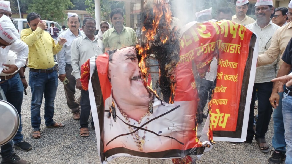 चंद्रपूर : मुख्यमंत्री एकनाथ शिंदे शिवसेना गटाचे आमदार संजय गायकवाड यांनी ९० टक्के कर्मचारी भ्रष्ट असल्याचे वक्तव्य केले. त्यामुळे संपकरी कर्मचाऱ्यांत संतापाची लाट उसळली असून राजुरा तहसील कार्यालय परिसरात संपकरी कर्मचाऱ्यानी आमदार गायकवाड यांच्या पुतळ्याचे दहन करून शिंदे शिवसेना व आमदार गायकवाड यांचा जाहीर निषेध केला तसेच सरकारच्या विरोधात घोषणाबाजी केली.