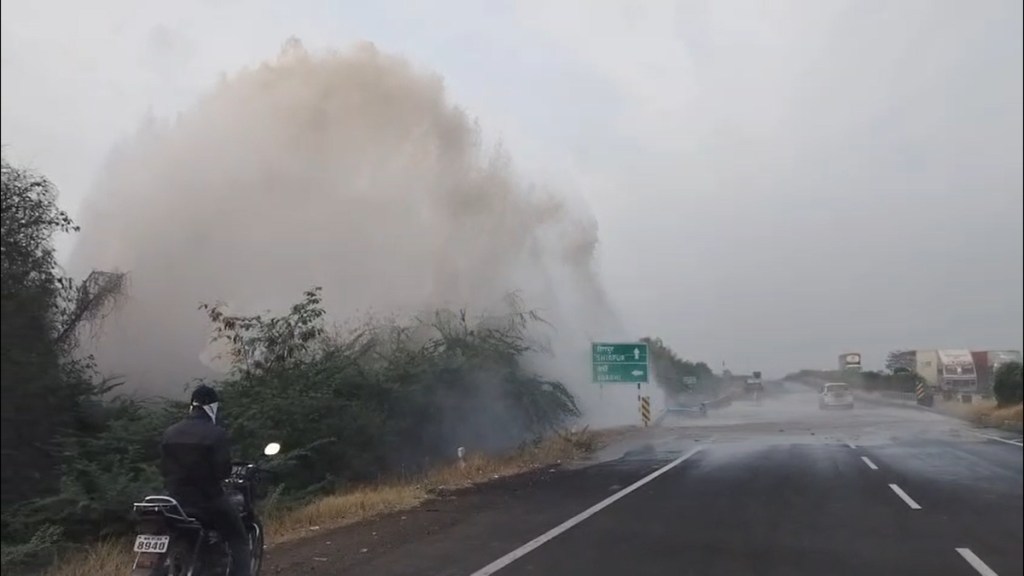 धुळे : मुंबई–आग्रा राष्ट्रीय महामार्गावरील वर्षी फाट्याजवळ धुळे शहराला पाणीपुरवठा करणारी तापीची मुख्य जलवाहिनी अचानक फुटल्याने परिसरात एकच खळबळ उडाली. जलवाहिनी फुटताच महामार्गावर तब्बल २५ ते ३० फूट उंचीचे पाण्याचे फवारे उडू लागले आणि हजारो लिटर शुद्धीकरण केलेले पिण्याचे पाणी अक्षरशः रस्त्यावर वाहून गेले.