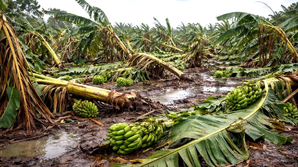 गेल्या आठवडाभरापासून जिल्ह्यात अनेक ठिकाणी अचानक हवामान बदलून जोरदार वारे, विजांच्या कडकडाटासह पाऊस होत आहे. या वादळामुळे रब्बी पिकांसोबत केळीच्या बागांमधील झाडे मोठ्या प्रमाणात उन्मळून पडली आहेत. काही ठिकाणी केळी पाने फाटली आहेत. विशेषतः रावेर, यावल, चोपडा, जळगाव आणि मुक्ताईनगर तालुक्यांमध्ये परिस्थिती गंभीर असून, शेकडो हेक्टरवरील केळीच्या बागांचे नुकसान झाल्याचा प्राथमिक अंदाज आहे. वादळी वाऱ्यामुळे केळीची उंच झाडे आडवी होऊन घडांना धक्का बसला आहे. अनेक ठिकाणी घड पूर्णपणे खराब झाले असून, बाजारात विक्रीयोग्य राहिलेली नाहीत. यंदा केळीचे उत्पादन चांगले झाले असले, तरी बाजारात दर कोसळले आहेत. मागील वर्षी प्रति क्विंटल २,००० ते २,५०० रुपये भाव मिळणाऱ्या केळीला यंदा जेमतेम ८०० ते १,२०० रुपये भाव मिळत आहे. त्यामुळे उत्पादन खर्चही निघत नसल्याची शेतकऱ्यांची तक्रार आहे.
