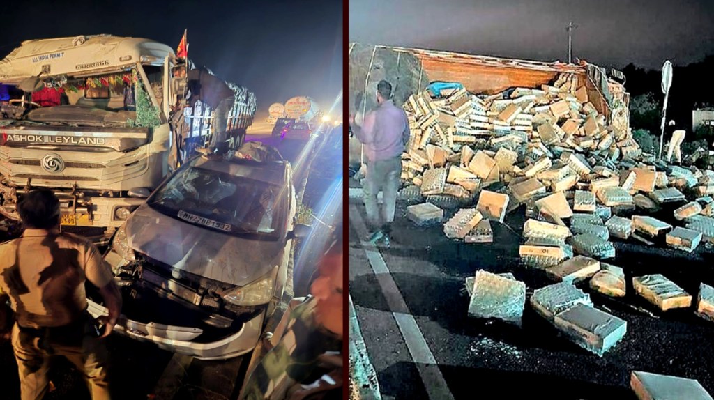 जळगाव : शहरालगतच्या पाळधी ते तरसोद बाह्यवळण महामार्गावरील गिरणा नदी पुलाजवळ शुक्रवारी रात्री सुमारे १० वाजेच्या सुमारास भीषण अपघात झाला. काचेच्या बाटल्यांनी भरलेला कंटेनर अचानक कलंडल्याने मागून येणाऱ्या सहा वाहनांची एकमेकांवर धडक झाली. या अपघातात सर्व वाहनांचे मोठ्या प्रमाणात नुकसान झाले असून, एका ट्रकचालकास दुखापत झाली आहे. अपघातामुळे सुमारे अर्धा ते पाऊण तास वाहतूक पूर्णपणे ठप्प झाली होती.