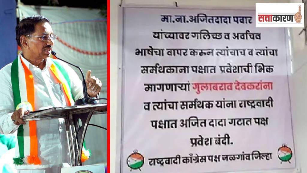 जळगाव – शरद पवार यांचे निष्ठावंत माजी मंत्री गुलाबराव देवकर यांनी राष्ट्रवादीच्या अजित पवार गटात प्रवेश करण्याची तयारी केल्यानंतर जळगाव ग्रामीणमधील पदाधिकाऱ्यांनी त्यांना तीव्र विरोध केला आहे. जळगाव जिल्हा कार्यालयात पक्ष प्रवेश बंदीचे फलक लावत अनेकांनी आपली जाहीर नाराजी व्यक्त केली आहे. विधानसभेच्या निवडणुकीदरम्यान उपमुख्यमंत्री अजित पवार आणि पक्षाच्या विरोधात केलेल्या वक्तव्यांच्या पार्श्वभूमीवर देवकर यांना पक्षात प्रवेश देऊ नये, असे संबंधित पदाधिकाऱ्यांनी म्हटले आहे.