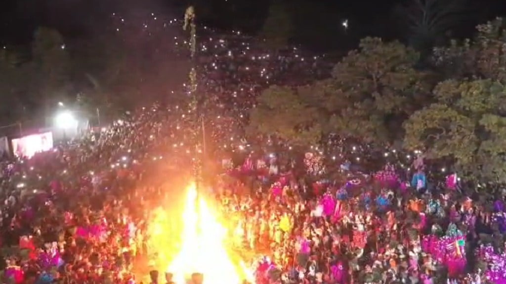 याआधी रात्रभर या ठिकाणी आलेल्या प्रत्येक आदिवासी बांधवाने आपल्या हाताने दोन मूठ माती कोरत होळीचा खड्डा तयार केला. या खड्ड्यात बांबु ठेवुन होळी उभारण्यात आली. मंगळवारी पहाटे सहाच्या सुमारास होळी प्रज्वलीत करण्यात आली. यावेळी आदिवासी बांधवांनी एकच जल्लोष करत होळी भोवती पारंपरिक पद्धतीने फेऱ्या मारल्या. हजारो आदिवासी बांधव एकाच वेळी होळीला घेत असलेल्या फेऱ्यांमुळे अदभुत नजारा दिसुन आला. यावेळी होळीचा बांबु पूर्व दिशेला पडला. हा बांबु पूर्वेला पडल्यास आगामी वर्षभरात भरभराटी आणि सुख नांदेल, असा आदिवासी बांधवांचा समज आहे. बांबु इतर दिशेला पडल्यास संकट, महामारी अशा विविध समस्यांना सामारे जावे लागले असते, असा समज आदिवासी बांधवामध्ये आहे.
