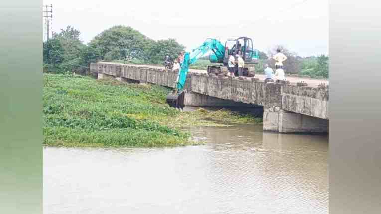 गोदावरी, दारणा आणि उपनद्यांच्या पाणलोट क्षेत्रात जोरदार पाऊस होत असल्याने गोदावरीतील पाण्याची पातळी वाढली आहे. नांदूर मध्यमेश्वर धरणातून देखील गोदापात्रात विसर्ग केला जात आहे. यामुळे प्रवाहाला वेग आला आहे. या सर्व परिस्थितीमुळे नदीपात्रात फोफावलेल्या पानवेली आणि अन्य पान वनस्पती या वेगवान प्रवाहात वाहून जाणे सुरु झाले आहे. या वाहून जाणाऱ्या पानवेली करंजगाव आणि कोठुरे दरम्यान नदीपात्रातील पुलाच्या भिंतींना अडकत आहेत. यामुळे या ठिकाणी पाण्याचा प्रचंड फुगवटा निर्माण होऊन पुलाला तसेच आजूबाजूच्या शेतजमिनींना धोका निर्माण झाला आहे. पुलाचे होणारे संभाव्य नुकसान टाळण्यासाठी जेसीबीच्या सहाय्याने या पुलाला अडकलेल्या पानवनस्पतींचे जंजाळ मोकळे करण्याचा प्रयत्न प्रशासनाकडून करण्यात येत आहे.