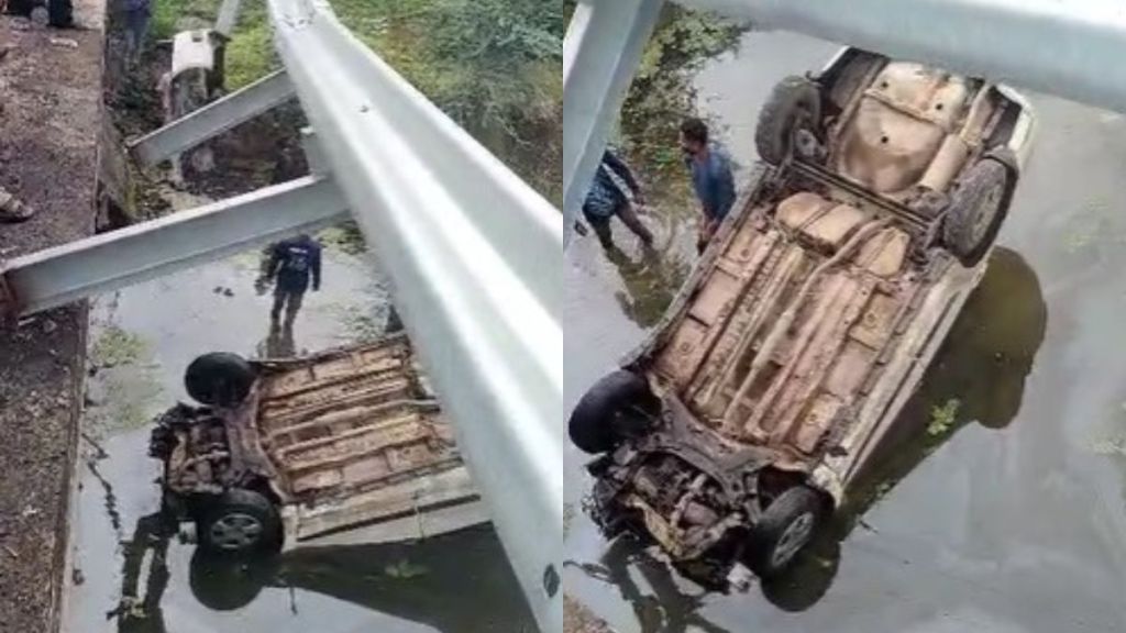 जळगाव: अमळनेर शहरानजीक अवघ्या दोन-तीन किलोमीटरवरील चोपडा रस्त्यावर चालकाचे नियंत्रण सुटल्याने भरधाव मोटार पुलाचे लोखंडी कठडे तोडत थेट वीस-पंचवीस फूट खोल नाल्यात कोसळली. ही घटना रविवारी सकाळी घडली.