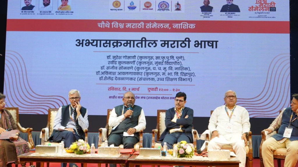 येथील के. टी. एच. एम. महाविद्यालयाच्या आवारात आयोजित विश्व मराठी संमेलनात परिसंवाद झाला. उच्च शिक्षण संचालक डॉ. शैलेश देवळाणककर , कुलगुरू डॉ. अविनाश आवलगावकर, यशवंतराव चव्हाण महाराष्ट्र मुक्त विद्यापीठाचे कुलगुरू डॉ. संजीव सोनवणे, मुंबई विद्यापीठाचे कुलगुरू रवींद्र कुलकर्णी, सावित्रीबाई फुले पुणे विद्यापीठाचे कुलगुरू डॉ. सुरेश गोसावी यांनी परिसंवादात सहभाग घेतला.
